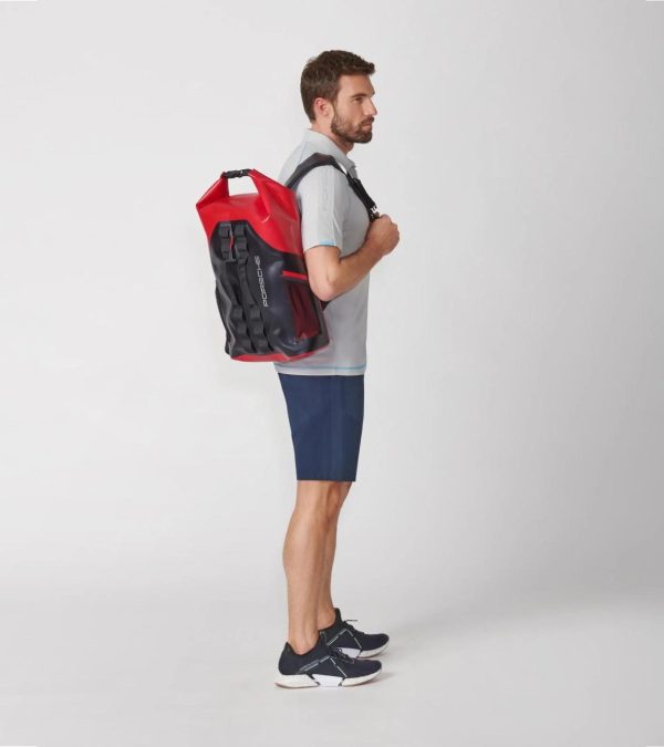 Everything safely in place: There’s room for everything you need in the Porsche Lifestyle waterproof backpack. The large main compartment with a roll top and zipper has a separate inner compartment for a laptop. A small separate front compartment with a zipper as well as side insert pockets provide space for a wallet, keys and other small items that shouldn’t get lost.