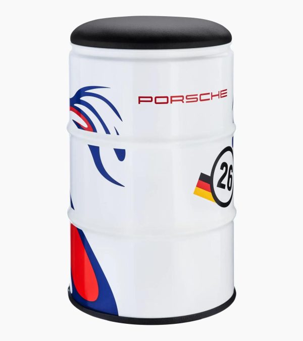 Stylish Porsche barrel seat with high-quality film wrapping. Suitable for indoor and outdoor use.Take a seat – and feel the race track: a real oil drum becomes a unique piece of furniture for all racing, Porsche and design fans. The high-quality film wrapping based on the GT1 design is waterproof and weatherproof, making the barrel suitable for both indoor and outdoor use. The upholstered seat guarantees typical Porsche comfort everywhere.