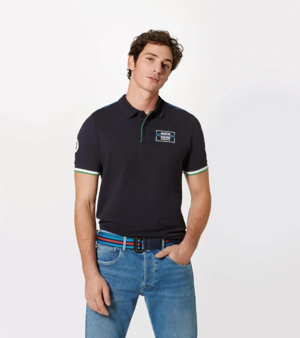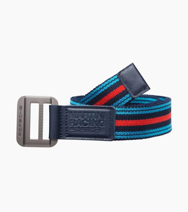 Infinitely adjustable woven belt with leather end in typical MARTINI RACING® colours.A woven belt in the typical MARTINI RACING® colours. Infinitely adjustable. The buckle is embossed with the ‘PORSCHE’ logo. The ends of the belt are edged in leather. Leather on the buckle embossed with ‘MARTINI RACING® Porsche’ logo. An additional length of 20 cm has been factored in as the belt is infinitely adjustable.