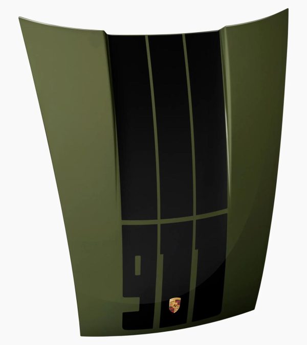 Original bonnet of the historic Porsche 911 (G model) in the design of the 911 Spirit 70. Magnetic, with hanging device for wall mounting. Production to order, production time up to 16 – 20 weeks.A piece of Porsche history for your home: the bonnet of the Porsche 911 (G model) in the legendary Safety Stripes design of the 911 Spirit 70 is an impressive decorative object and a magnetic board. The Porsche Crest completes its true-to-original, stylish design.