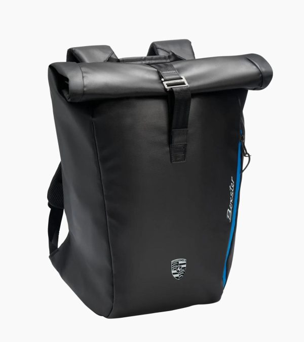 Porsche Lifestyle roll-up backpack: smart design for on the go. Made of tarpaulin material, with 3D Boxster branding.Stylish on the go: the Porsche Lifestyle roll-top backpack made of tarpaulin material combines design and function. The spacious main compartment, a separate laptop compartment and various slot and zipped compartments for smaller accessories such as keys and wallets offer plenty of storage space. The front bears the Porsche crest and the three-dimensional Boxster brand logo with a blue background. The padded back made of mesh material and the ergonomically shaped, padded shoulder belts ensure optimal carrying comfort. The additional zip compartments with blue zip tape on the front are a visual highlight and offer additional storage space.