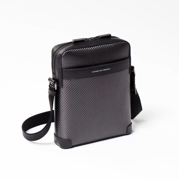 Porsche Design shoulder bag with organiser and padded compartment for tablets.The thrill of carbon: the high-tech material from motorsport gives the vertical shoulder bag – like all models in the Carbon Collection – its unmistakable design DNA. Light, structured carbon-fibre fabric and the finest box calf leather are combined with in an iconic, minimalist design to make the bag an exclusive, timelessly stylish accessory. A practical business organiser and a padded compartment for tablets can be found in the easily accessible main compartment, while another compartment with a magnetic closure features on the front of the bag. The carrying strap is adjustable. High-quality metal accessories in a galvanised gunmetal finish round off the look of the shoulder bag.