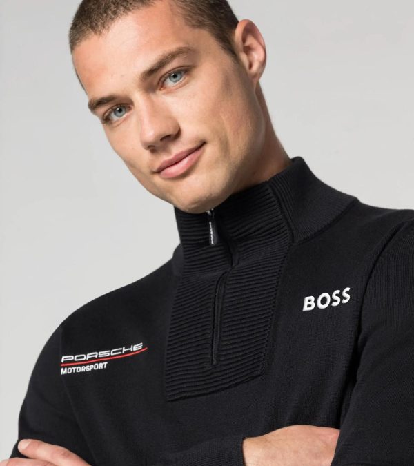 Half-zip pullover with stand-up collar, inspired by the original Porsche Motorsport team clothing.Troyer with stand-up collar and short zipper. Based on the original Porsche Motorsport Team clothing. Porsche Motorsport and Hugo Boss logo embroidered on chest. Michelin and Mobil1 logo embroidered on upper arm. Hugo Boss logo embroidered on back.