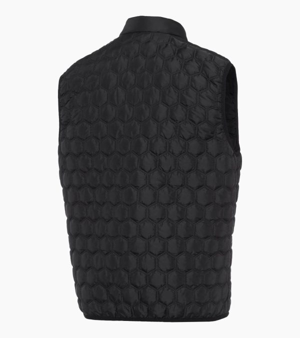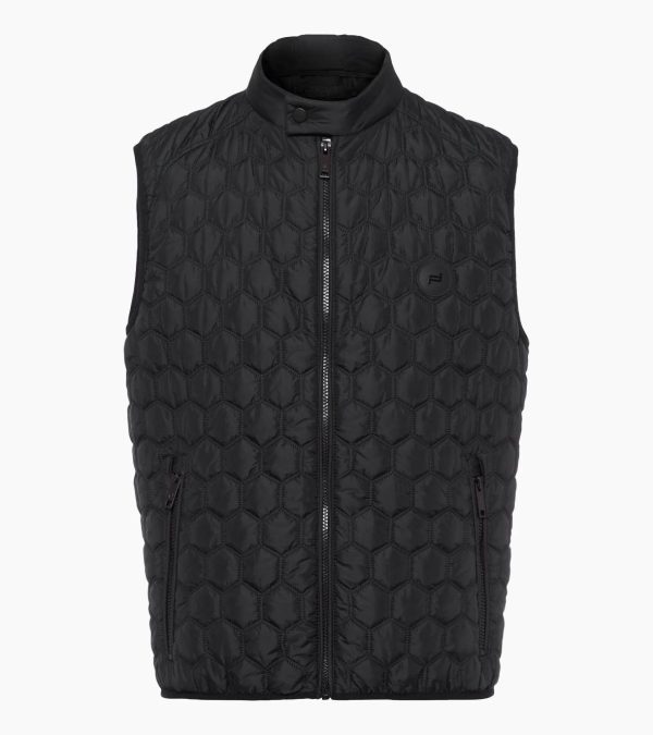 Lightweight Porsche Design vest with hexagon quilting, down-free filling and concealed zip pockets. Made in Europe.Functionality meets design – the super lightweight vest from Porsche Design captivates with modern hexagon quilting and an innovative, down-free filling that is produced using a special fibre filling machine. The straight cut gives the vest a timeless shape, while the concealed zip pockets at the hips and the chest pocket offer convenient storage space. The individually crafted zip pullers with Porsche Design logo add a subtle highlight. The inner lining features sandwich quilting and two additional pockets.