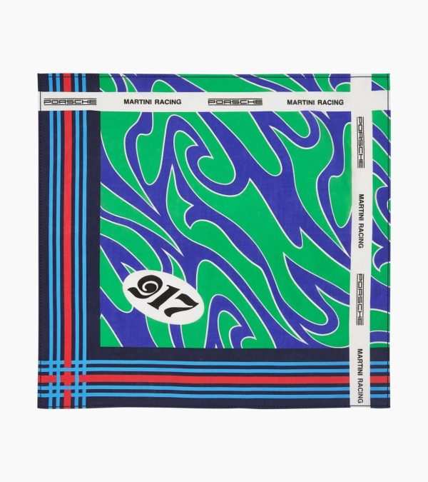 Neckerchief inspired by Porsche 917 ‘Hippie’ and the original ‘Hippie’ scarf that Mary, the wife of Vic Elford, wore at Les Mans in 1971. This neckerchief can be worn as a neck scarf, head scarf or as decoration on a bag.