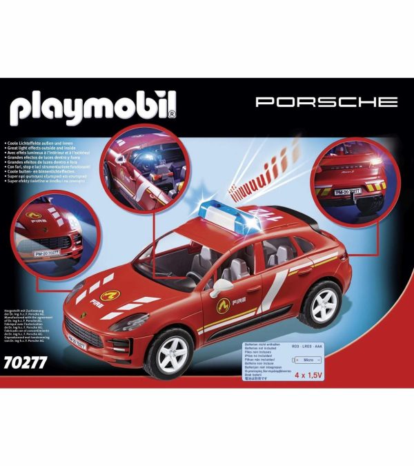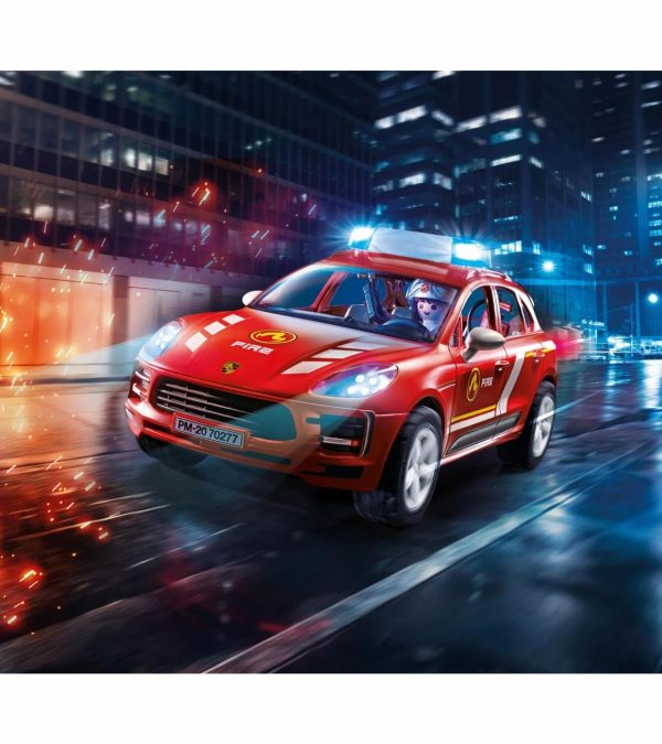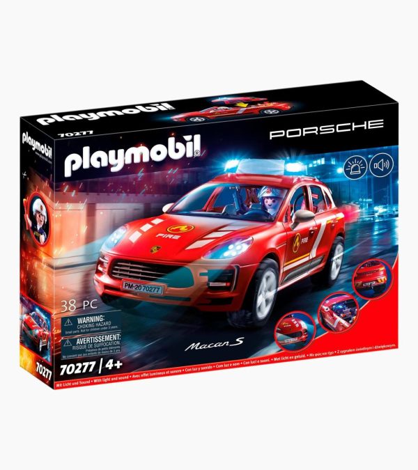 PLAYMOBIL playset consisting of one figure and a Macan S with removable roof, flashing light and sound, as well as illuminated dashboard and lots of firefighting accessories.