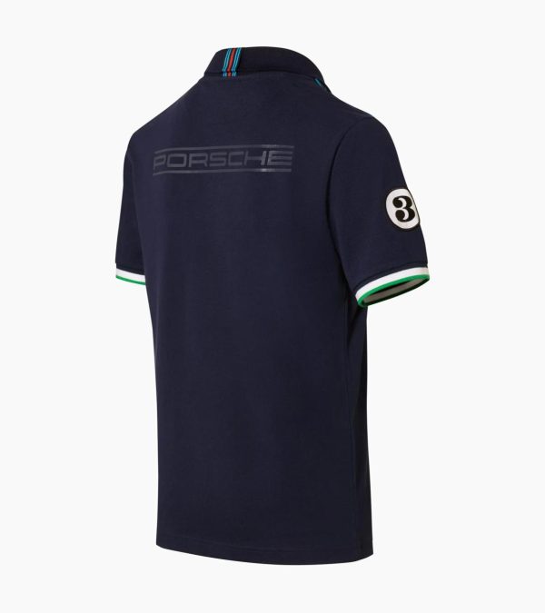 Short-sleeve polo shirt with two buttons. Shoulders and collars with ribbons in the typical MARTINI RACING® colours. ‘MARTINI RACING® PORSCHE’ badge on the chest and badge with number 3 on the upper arm. ‘Porsche’ logo printed tonal on the back. Collar patch inspired by Porsche 917 ‘Hippie’.