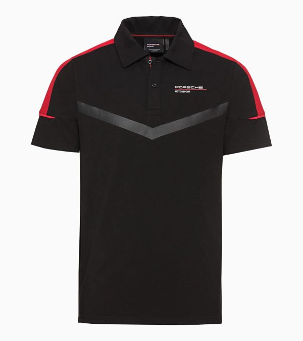 Men’s polo shirt with ‘PORSCHE MOTORSPORT’ signet.The classic way to show your true colours – the short-sleeve polo shirt with large ‘PORSCHE MOTORSPORT’ signet on the front and tonal Porsche logo on the back makes it clear straight away just which team you are rooting for on the race track.