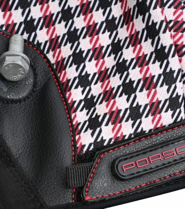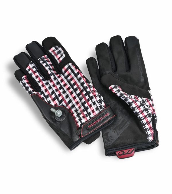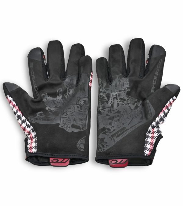 Porsche Classic assembly gloves in size 7 with Red Pepita pattern, 901 engine illustration, and embedded magnet for fasteners.