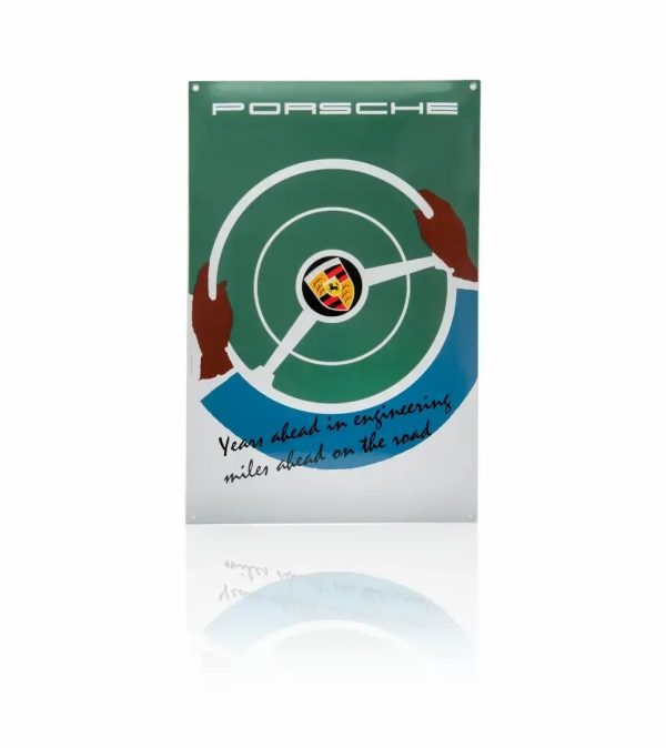 These commemorative Porsche ads come from the 20th century heyday of the advertising medium. The enamel surface means years of use on your den or garage wall, with a simple wipe of a cloth to restore their luster. They attach though holes in each corner.