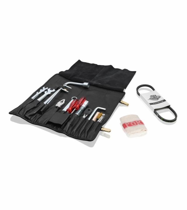 Porsche Classic tool bag; suitable for all Porsche 911 F from model years 1965 to 1973. Contents: 5x double open-ended spanners (one each 8×9, 10×11, 12×13, 14×15 and 17×19), 1x wheel nut spanner 19, 1x holding tool for V-belt pulley, 1x combination pliers, 1x combination spanner 19/22, 1x Phillips screwdriver B2, 1x screwdriver, 1x spark plug spanner, 1x spark plug ratchet spanner, 1x Allen key, 1x brush 1x feeler gauge, 1x V-belt 9.5×710, 1x cleaning cloth. In addition, the real leather case combines a high-quality pepita houndstooth look with a highly functional design, with a particular slot for each tool. Based on the genuine parts, the tools have been produced, improved and are now embellished with Porsche lettering. Tested by our Classic experts, the new 911 tool bag meets the highest standards of functionality and quality.