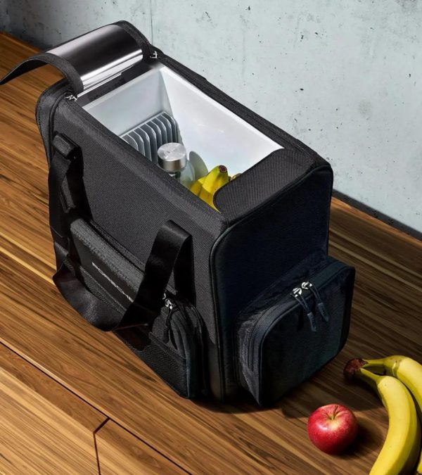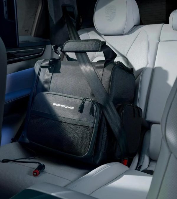 Black cool bag with a volume of approx. 14 litres and “PORSCHE”logo. With 12 V connection for cooling drinks and food in the vehicle. For safe transport, the cool bag can be secured on the rear seat bench using the vehicle seat belt.