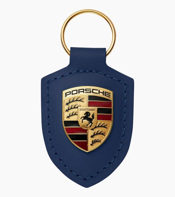 Key chain made of real leather in the shape of the Porsche crest.Metal Porsche Crest on leather fob.