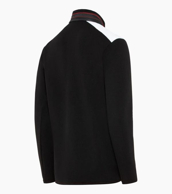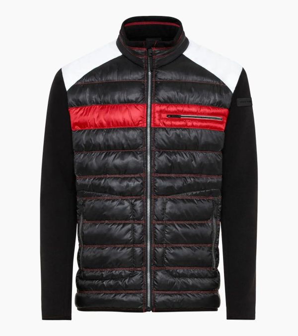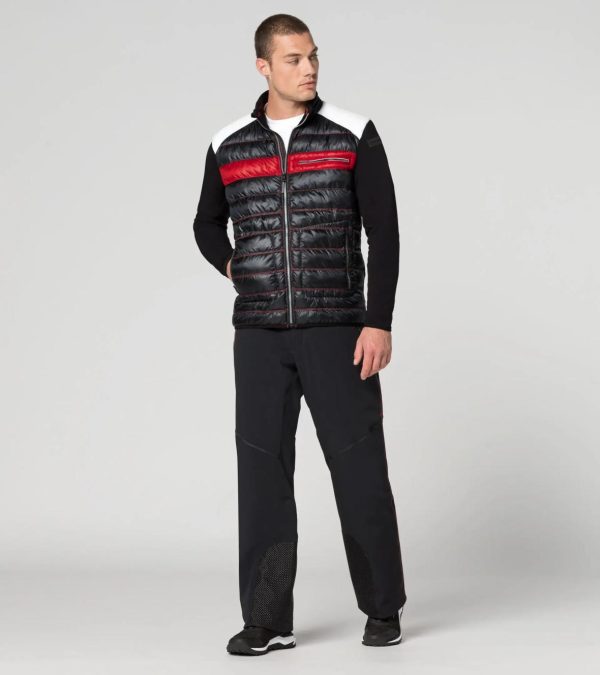 Designer men’s ski midlayer by PORSCHE HEAD with PrimaLoft padding. The sleeves and back of the zip-up ski pullover are made of body-mapped stretch.Dynamic even when standing still: ThePORSCHE HEAD Midlayer from the new PORSCHE HEAD Capsule Collection. This second-layer jacket, like the matching PORSCHE HEAD Ski Jacket and Ski Pants, transfers the drive from Porsche onto the slopes of the world and impresses with its clever concept and a design inspired by Porsche Motorsport. The midweight hybrid construction adapts perfectly to every movement thanks to body-mapped brushed power stretch for the back and sleeves. The horizontally quilted front made of lightweight ripstop is warming, thanks to the PrimaLoft padding – like a down lining, yet more robust and not affected by moisture. The exclusive wearing comfort is given a final touch with the softly lined stand-up collar, stretch cuffs on the sleeves and hem and light YKK VISLON® zips on the front, breast pocket and side pockets.
