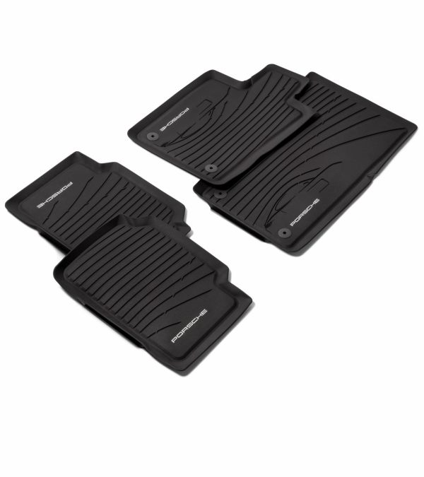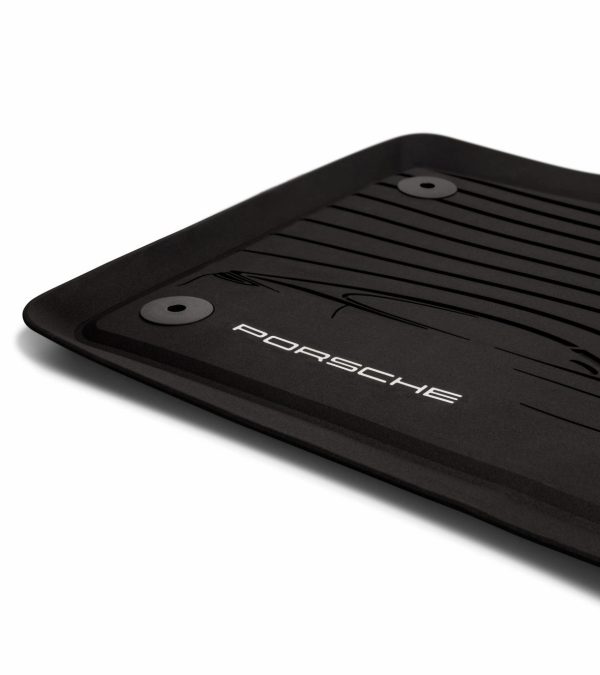Four-piece set in attractive design with vehicle silhouette and silver “PORSCHE”logo. Non-slip and impermeable to water, with raised surrounding rim. With fastening points in the rear area. Available for the following models: