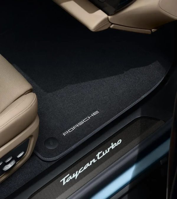 Upgrade your Porsche Taycan interior with our luxurious four-piece floor mat set in interior color Blackberry. Each mat is meticulously crafted to complement your vehicle’s aesthetics, featuring a high-quality Nubuk edging and an intricately inlaid, silver-embroidered ‘PORSCHE’ lettering. Available in various interior colors to match your personal style, these mats not only enhance the look of your vehicle but also offer durability and protection for your vehicle’s flooring.