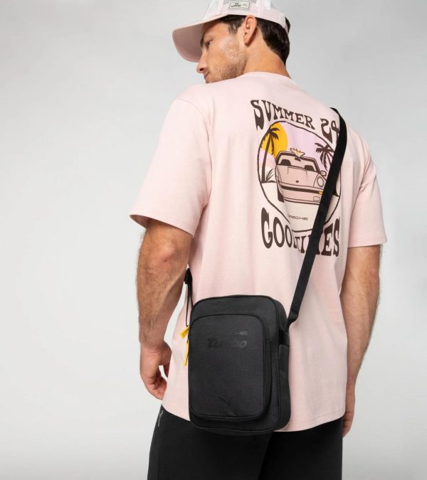 Stylish shoulder bag with Porsche Turbo 3D print and Puma logo.Comfortable for everyday life: The stylish shoulder bag impresses visually with the 3D Porsche Turbo print and the Puma logo. The separate zip pocket on the front offers space for all essentials.