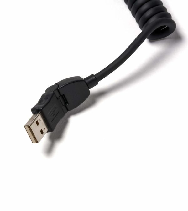 Spiral cable with movable USB connector and angled Smartphone connection. Approx. 8 – 20 inches (20 – 50 cm) length. For charging the smartphone and for playing music (can be operated via steering wheel and PCM).