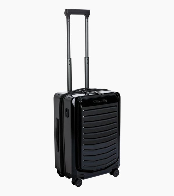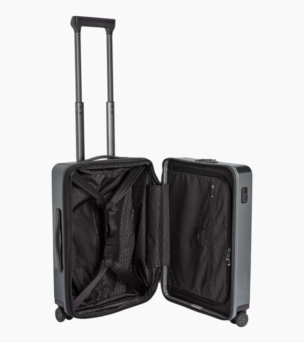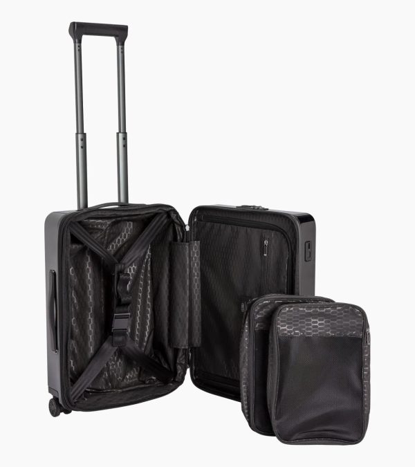 Very light business trolley with front pocket from Porsche Design. Smooth-running wheels. Accepted as carry-on luggage by most airlines.Ultra-light and inspired by the colours of the Porsche 911: the Roadster Hardcase Collection. Developed by Studio F.A. Porsche, this suitcase series is made of polycarbonate and is the perfect fusion of form, function and design. The Porsche Design Roadster hardcase business trolley S in carry-on luggage size impresses with its clever construction, a weight of only 3.9 kg, dynamic look in a rim design and the Porsche Crest made of genuine leather. The spacious front pocket with business equipment and USB plug-in provides space for a notebook, documents and extras that you want to access quickly at the airport. Smooth running wheels with ball-bearings and a multi-height handle system with an ergonomic grip ensure perfect performance. It is especially easy to place bags over the handle, and remove them again, thanks to its rounded edges. The divided interior can be expanded spontaneously at any time and, like the front flap, is protected by a double TSA lock and an anti-theft zip.