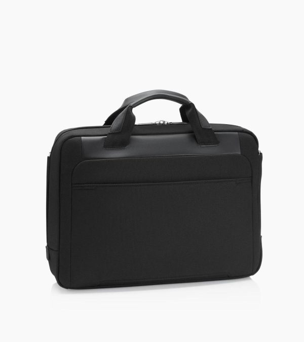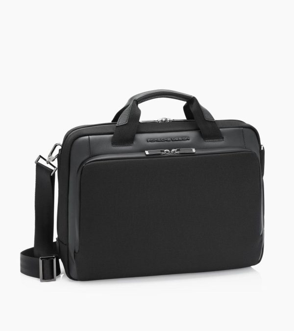 Slimline, modern business briefcase for men in nylon and smooth leather. Two main compartments with integrated 15-inch laptop case. Handles and shoulder strap.The Porsche Design Roadster Nylon Collection stands out from the crowded field of classic business bags with smart functionality and its exclusive, technical design. The combination of structured nylon and striking smooth leather makes the Porsche Design Roadster Nylon Briefcase S a real eye-catcher—the format of this briefcase is ideal for modern needs. Large enough to transport the essentials—smart enough for the office or meeting room. In the roomy main compartment is an integrated 15-inch laptop case. In the separately accessible front pocket is a business organizer including carabiner. The trolley link makes air travel easier—on shorter journeys, this travel bag can be carried comfortably over your shoulder courtesy of the padded shoulder strap—or casually carried in your hand.