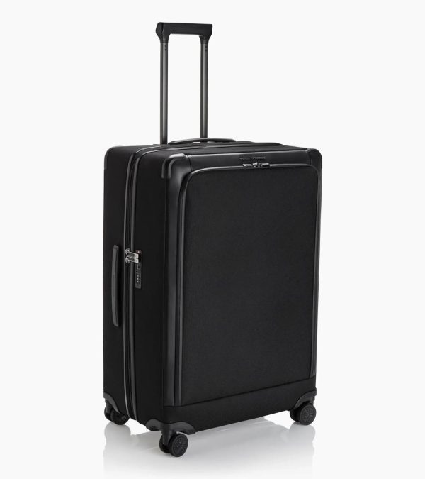 Large, elegant Porsche Design trolley made of water-repellent nylon and leather.Made to meet demands: the Roadster Nylon Collection is particularly impressive thanks to its modern mix of materials, versatile and sophisticated details – including real leather – and optimum functionality. The large trolley is perfect when travelling. Its spacious interior with separating straps and packing divider can be expanded with a second zip and offers plenty of space for clothing, toiletries bags and more. Valuables and smaller essentials can be stored in the additional front pocket, which features a business organiser. Particularly quiet wheels, a high-quality handle system and additional handles on the side and the top ensure maximum comfort when on the go. The protection pad on the trolley’s impact-resistant upper corners protects it from damage.