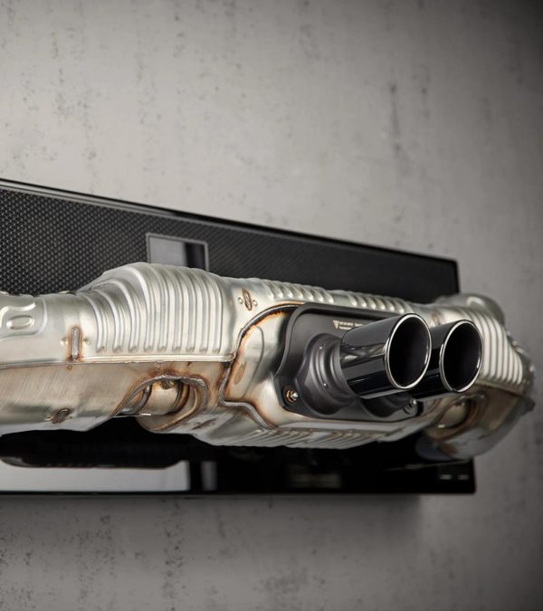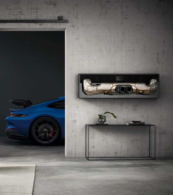 2.1.2 Virtual surround sound system made from an original 992 GT3 exhaust system.From 0 to goosebumps – in a single sound curve. The strictly limited-edition (500 pieces) 911 Soundbar 2.0 Pro, made from the original Porsche 992 GT3 (992) exhaust system. The 2.1.2 Virtual Surround Sound System features 300 watts of system power, 4K compatible HDMI ports, Bluetooth 5.0, Dolby Atmos DTS-HD, streaming with Apple AirPlay 2 and Google® Chromecast built-in for multiroom. The Soundbar is equipped with in-room multi-channel streaming technology that connects with the 911 Soundbar Special Edition, the 911 Soundbar Final Edition as well as future new Porsche Originals sound products. It can be hung on the wall or placed on the base provided. Made in Germany.
