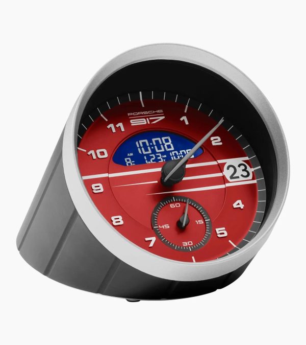 Stylish Porsche table clock in the 917 Salzburg design with LCD display, alarm function and calendar display.A piece of contemporary history: the table clock with a dial in the 917 Salzburg design was designed based on the Sport Chrono clock in the vehicle. The 917 Salzburg emblem decorates the back of the clock. The time is shown in both analogue and digital form on the LCD display. In addition, the clock boasts a calendar display with two selectable formats and a countdown function. A special highlight for all Porsche fans is the original engine sound as an alarm tone.