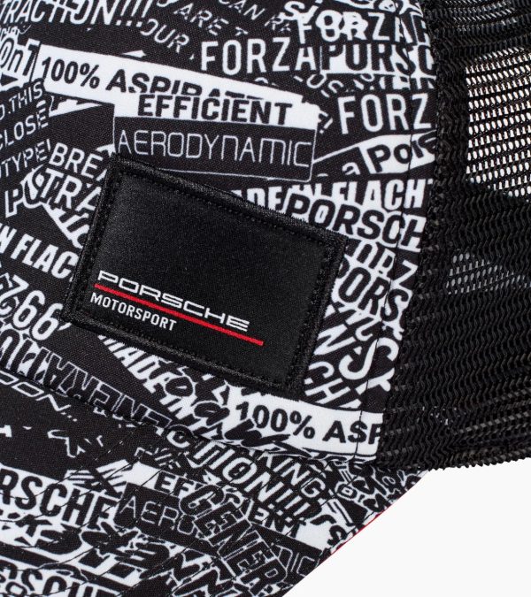 Sporty five-panel cap from Porsche made of 100% recycled material.Racing spirit, stylish design and quality combined in a single collection – with Motorsport Fanwear. The five-panel cap made of 100% recycled polyester features an all-over print inspired by the camouflage wrapping of the 911 GT3 R (992) and with inspiring Porsche sayings. The mesh back section provides refreshing ventilation to ensure all motorsport fans keep a cool head. The closure with Porsche embossing and the small sewn-on Porsche Motorsport label on the front underline the exclusive design of the cap.
