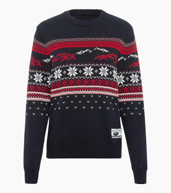 Porsche style of the season: comfortable unisex knitted pullover with crew neck and knitted Christmas motif.This high-quality unisex knitted pullover from Porsche’s Essential Collection is sure to generate Christmas cheer. The comfortable pullover features an elaborate Christmas motif knitted on the front, back and sleeves. The Porsche Christmas badge is sewn on the front.