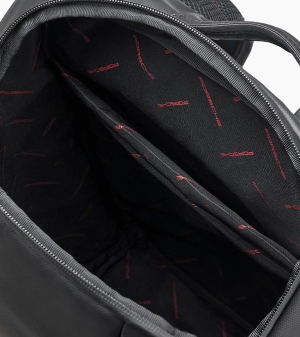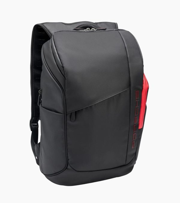 Smart business backpack from Porsche made from waterproof material. With separate laptop compartment and business organiser. Adjustable shoulder belts and padded back with trolley link.Stylish, Porsche, business: the business backpack from Porsche Lifestyle is made of water-repellent material and is the smart companion for your everyday business life. The backpack bears the Porsche logo on the front. The large main compartment offers ample storage space with two pockets. On the right is a side pocket with a business organiser and key fob. The backpack has a zipped compartment at the front and is equipped with additional side pockets that can be expanded for water bottles. A separate laptop compartment for laptops up to 15 inches. The shoulder belts are padded, individually adjustable and have an integrated carrying handle. The back part is padded and has a trolley link.
