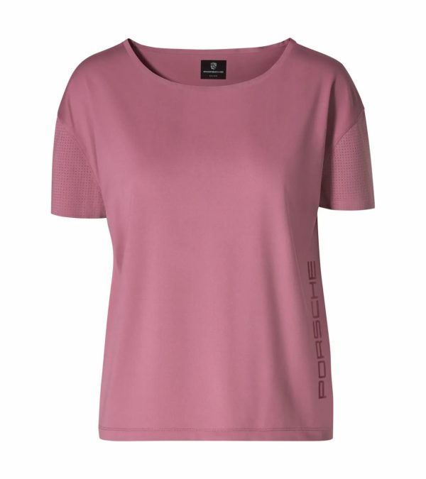 Breathable, loose-cut T-shirt made of functional jersey with large, transparent gloss print with “PORSCHE” logo.Loose-cut T-shirt with inserted, perforated sleeves and wide cut-out. In functional jersey. Breathable and quick-drying. Further perforation on the back. Large, transparent glossy print with ‘PORSCHE’ logo on the front and additional ‘PORSCHE’ logo on the back. Laser-cut and bonded edges on neckline and sleeve hem.