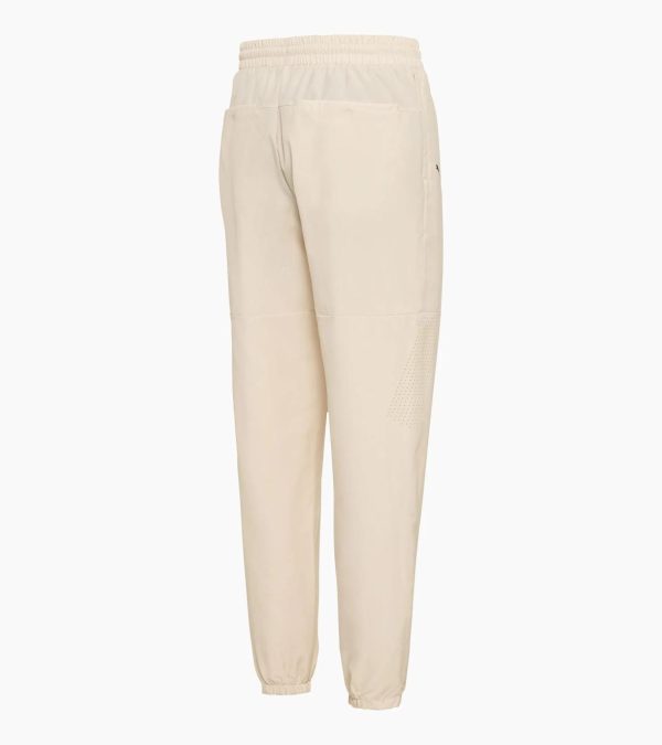 High-quality trousers from Porsche Design made of recycled stretch fabric in a regular fit. Moisture-regulating, wind and rain-repellent.A real statement in terms of looks, functionality and sustainability: the woven tech trousers with recycled First Mile® fabric, windCELL®, rainCELL® and dryCELL® technology as well as a moisture-regulating finish. The stretch fabric scores with outstanding comfort and also keeps you warm and dry. Laser cuts on the knees ensure the necessary breathability. The elastic waist band with adjustable drawstrings, two concealed zip pockets on the hips and two back pockets are also practical. The woven trousers are visually impressive with a horizontal seam running across the front and back on the thigh, and are a perfect match for the woven tech jacket.
