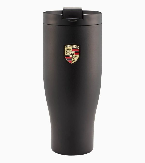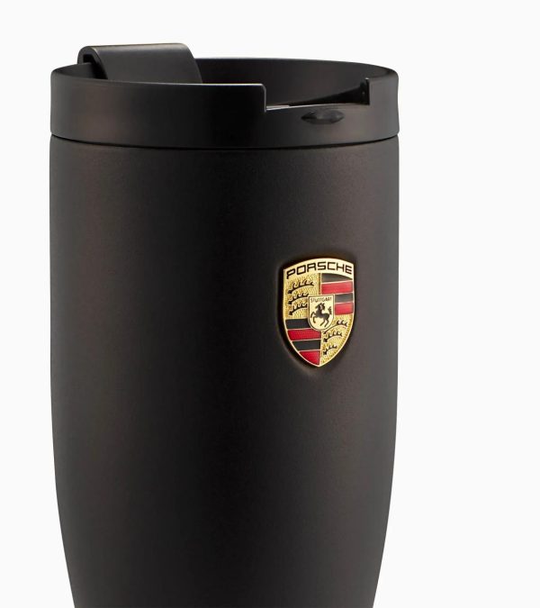 Generously proportioned thermal mug in black with Porsche crest.Keep hot drinks hot, and cold drinks cold with this insulated XL thermal mug with twin stainless steel walls. The Porsche crest is the sole, statement design element on the body of the mug, and an embossed “PORSCHE“ logo adorns the lid. The high-quality gift packaging makes this a stylish and practical present.